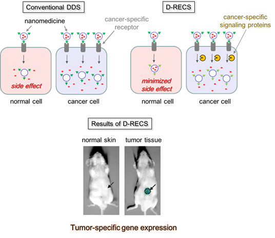 Drug delivery system (DDS) is an idea to delivey drug to diease site slectively to rasie the therapeutic efficacy but to reduce side effect. To achieve that, drug carriers modified with ligands against the marker proteins which are expressed in target cells have reported so far. However, such disease marker proteins somewhat expressed on healthy normal cells which sometimes leads to serius adverse effect. To overcome this issue, it is better to chang our mindset becuase such non-specific delivery to normal cell is inevitable. Thus, we have decided to desing DDS which does not work in normal cell. We are interested in intracellular signaling proteins which show varied patern of acitivities up to the kind of disease. We have desingned DDS which is activated responding to signaling proteins which are specific to kinad of disease. We named this D-RECS (Drug and Gene Delivery System Responding to Cellular Signal) and are applying to diseases including cancer, inflammation, and virus infection.