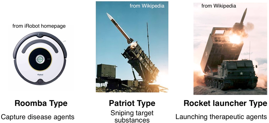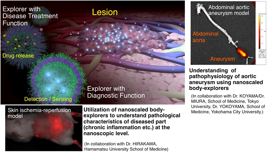 Drug therapy without hospitalization is considered to be the ideal form for disease treatment. However, in many cases, sufficient efficacy cannot be obtained even by using appropriate medicine. In our group, “nanoscaled body-explorers” that can target to the lesion have been developed through rational material design, in order to clarify mechanism of the intractable diseases toward creation of novel therapies.