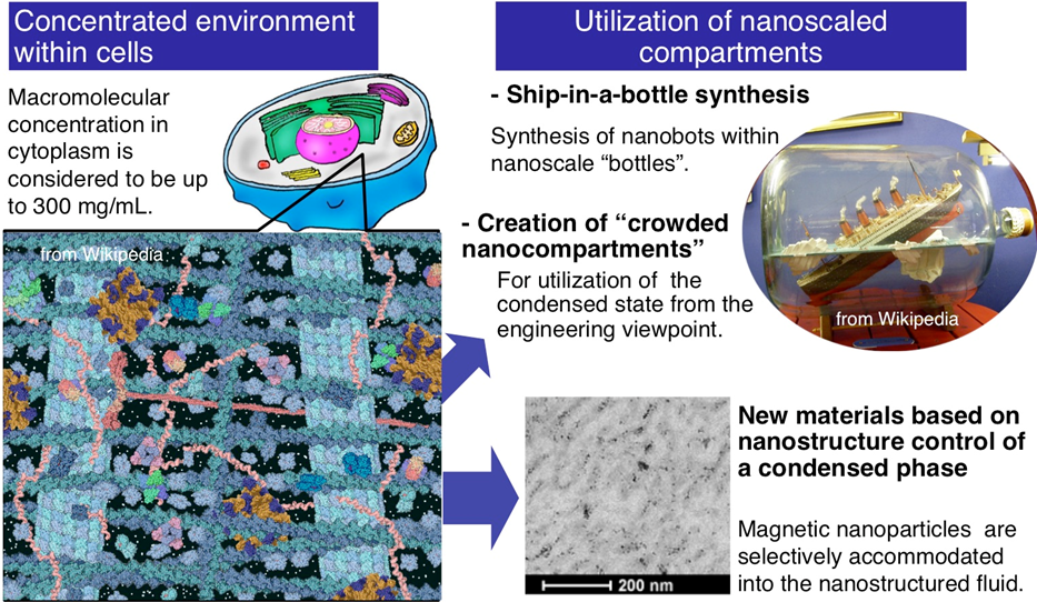 Even with massive kinds of biomolecules concentrated, cells can still operate regularly by being compartmentalized and precisely organized into function units. In our group, we have challenged to develop novel materials to mimic the concentrated and compartmentalized intracellular environments for utilization of their functions in an engineering approach.