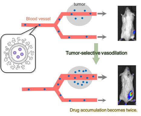 We are trying to improve the accmulation of nanomedicine to tumor. Based on the pathology and vasophisilogy of tumor, we desinged drug carrier which achives twice as high accumulation as a usual nanomedicine.