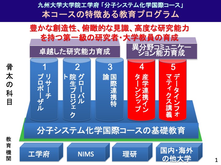 本プログラムは、グローバルCOE「未来分子システム科学」における国際化教育を発展させたものであり、最大の教育効果を生む種々の優れた新しい教育システムを導入する。 分子システム化学の基礎から先端にわたる特色のある教育プログラム(リサーチプロポーザル、グローバル院生プロジェクトなど)を構築する。